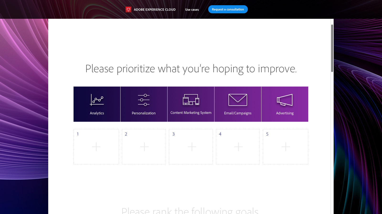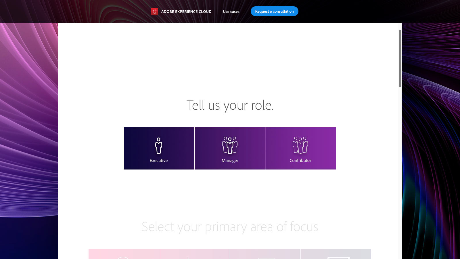Adobe was looking for a better way to lead enterprise-level customers through adobe.com. They wanted a new, self-guided "Jumpstart" experience that would educate visitors, while capturing information about them and their needs—with the goal of creating data sets the customer—and Adobe—could leverage.