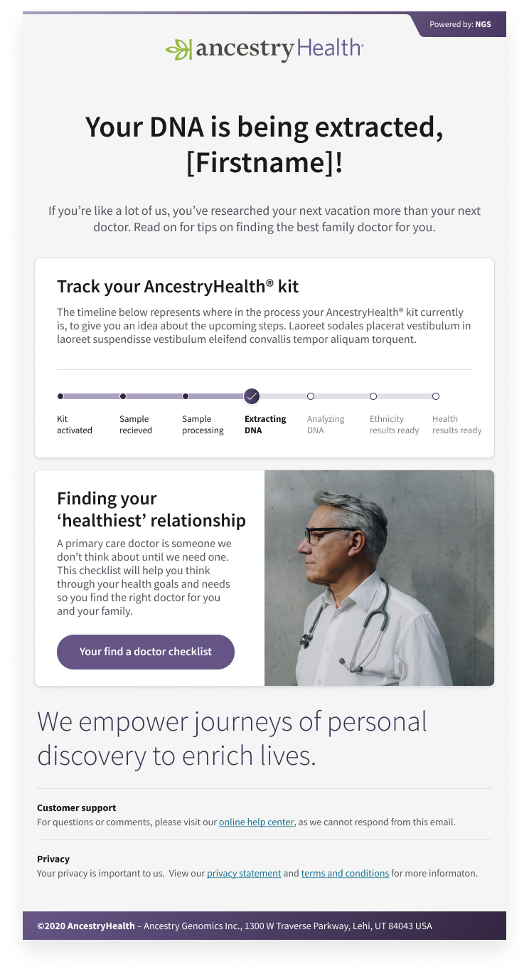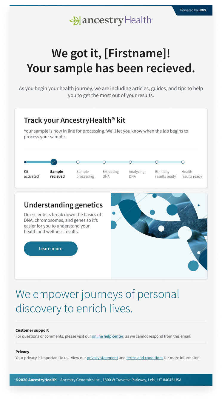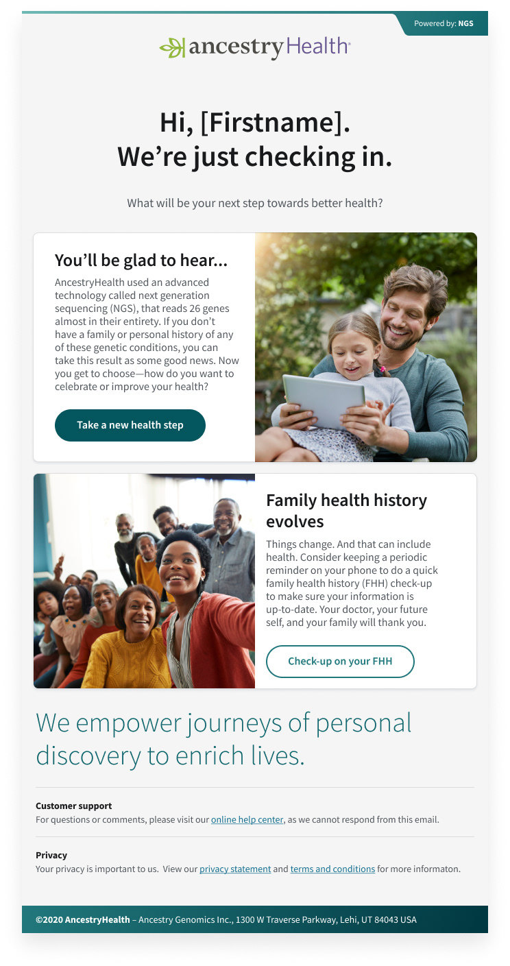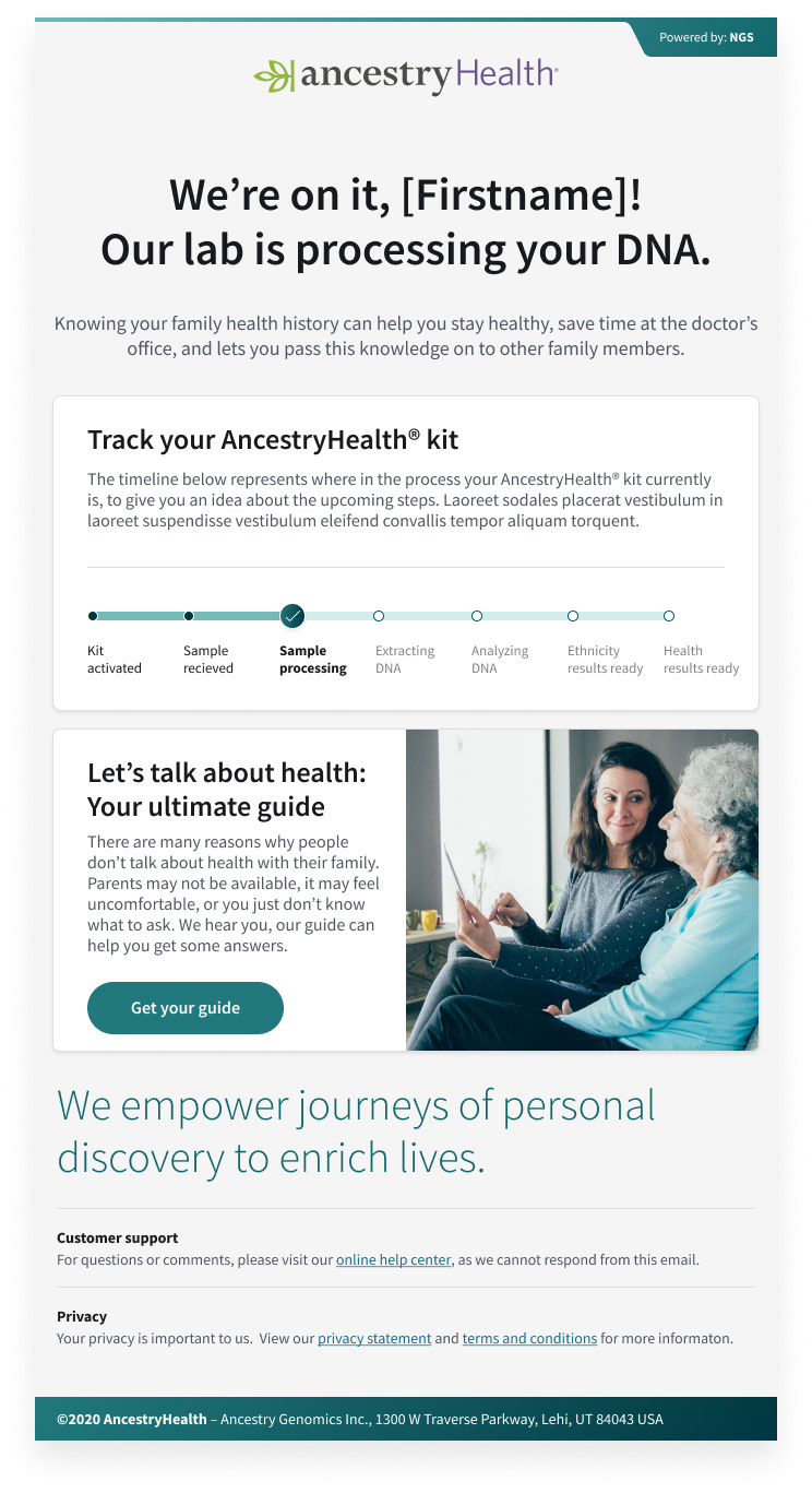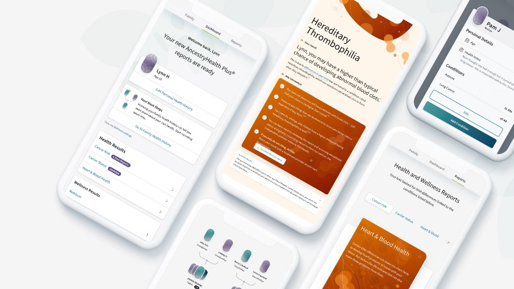 We created a digital health product, focused on the customer by utilizing ancestry's DNA data logistics to empower users to learn more about their health through DNA analytics. We built a fast and efficient experience—one that provided the precise information the user was looking for. Taking out the guesswork about inherited health risks when answers could be right here? AncestryHealth uses advanced genetic testing technology to give the customer a deeper view of their genetic health risks, so they can make the right calls for themselves and their family.